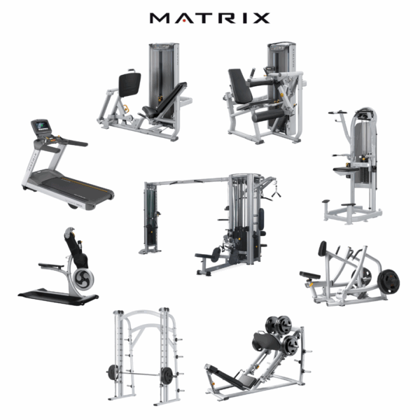 Packages include treadmills, ellipticals, rowing machines, strength machines, free weights, and functional training tools suitable for all fitness levels.